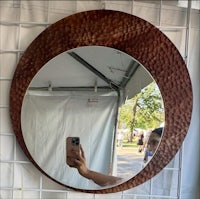 Off center mirror (18” diameter overall, 15” diameter mirror) framed in Claro walnut from retired orchard trees.